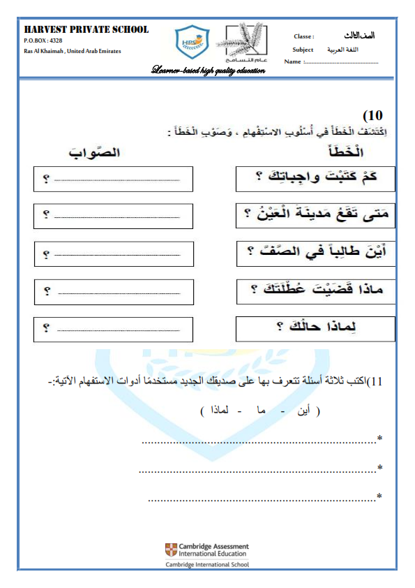 ورقة عمل في مادة اللغة العربية أدوات الاستفهام للصف الثالث مع الإجابات الفصل الثاني 2018 2019