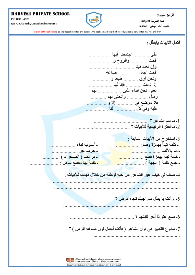 ورقة عمل لدرس نشيد انت الوطن في مادة اللغة العربية للصف الرابع الفصل الدراسي الاول
