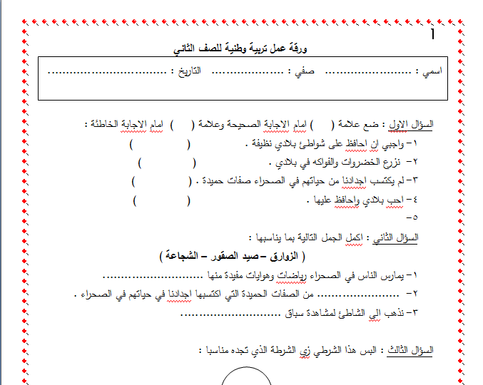 نموذج Word قابل للتعديل ورقة عمل لوحدة وطني هويتي لمادة الدرسات الاجتماعية الصف الثاني الفصل الثاني منتديات صقر الجنوب