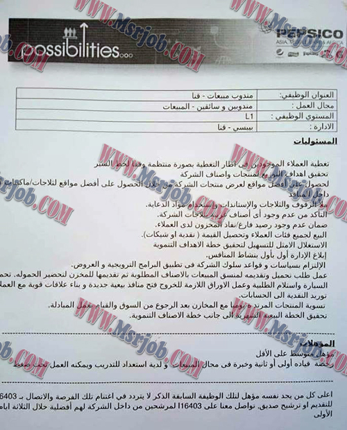 اعلان وظائف شركة بيبسي تطلب مندوبين وسائقين مؤهلات عليا ومتوسطة على الاقل 2019